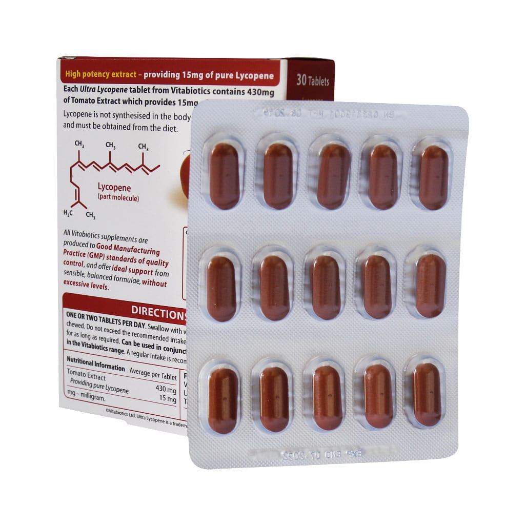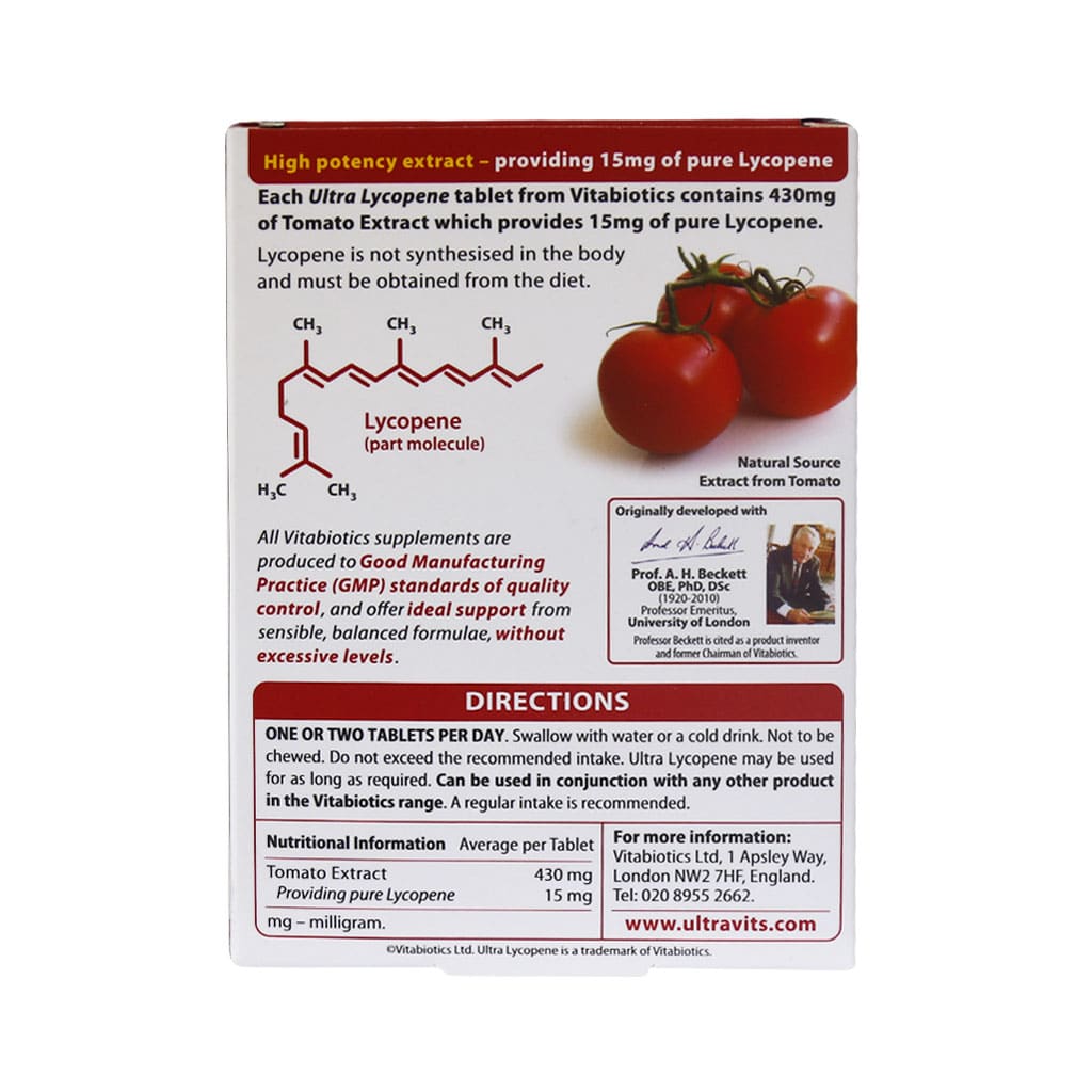 اولترا لیکوپن به ازای هر قرص حاوی 15 میلی گرم لیکوپن خالص (حاصل از 430 میلی گرم عصاره گوجه فرنگی) است. ليکوپن یک آنتی اکسیدان مربوط به خانواده کاروتنوئید ها است. این ترکیب که از اجزاي طبيعي رنگدانه گياهان است، باعث ايجاد رنگ قرمز در غذاهای طبیعی از جمله بسیاری از میوه جات و سبزیجات مي شود. از جمله مواد غذایی غنی از لیکوپن می توان به گوجه فرنگی، هندوانه، گریپ فروت و فلفل قرمز اشاره نمود. اگر چه لیکوپن در بسیاری از مواد غذایی طبیعی وجود دارد، با این حال، می توان آن را از طریق مکمل ها و فرآورده های حاوی این ماده مغذی، مانند قرص اولترا لیکوپن نیز دریافت نمود.