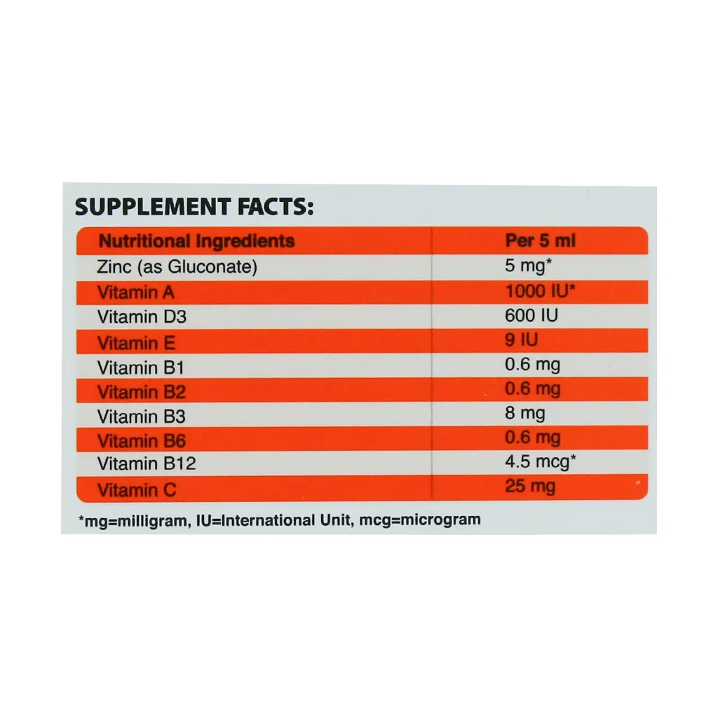 در هر 5 میلی لیتر از شربت زینک پلاس مولتی پدیابست، 600 واحد ویتامینD وجود دارد.