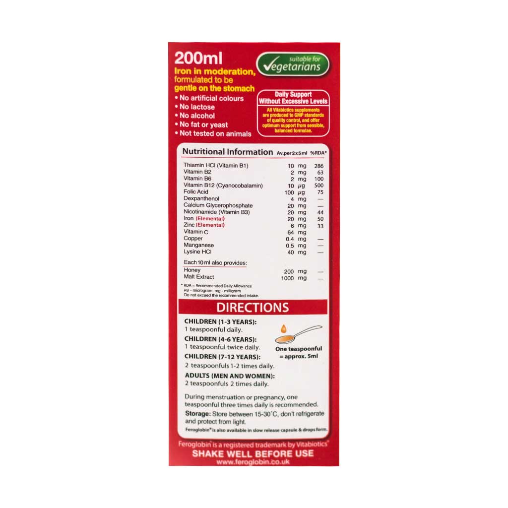شربت Feroglobin در هر 10 میلی‌لیتر حاوی 2 میلی‌گرم ویتامین B6 است.