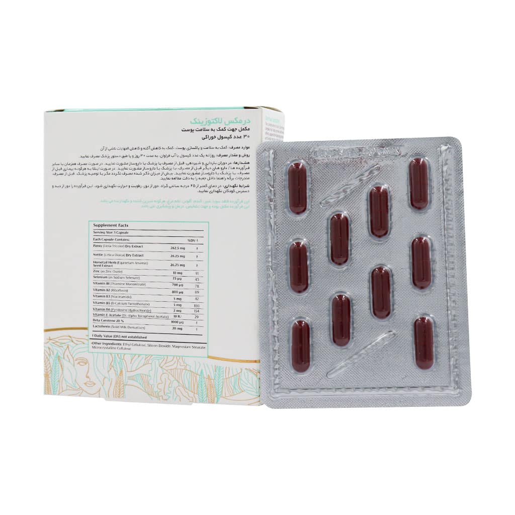 کپسول لاکتوزینک درمکس با ترکیب ترکیبات فعال و مؤثر مانند لاکتوفرین، روی، بتاکاروتن و عصاره‌های گیاهی، بر سلامت پوست تأثیر می‌گذارد و در فرآیند پاکسازی پوست از آلودگی‌ها و سموم نقش مفیدی ایفا می‌کند.